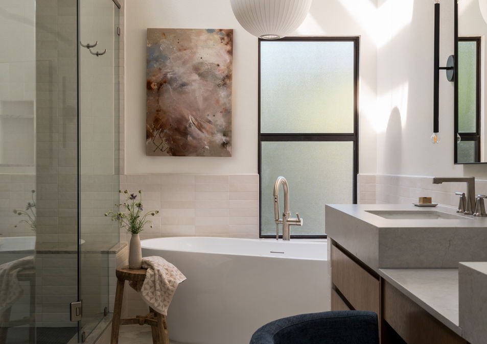 Design-wise, the materials did a lot of the talking. The quartzite stone shower wall brought in that bold tone, while creamy wall tiles and taupe star-and-cross accents softened the edges. The Nelson bubble lamp was the finishing touch—a warm glow that brings everything together and makes the room feel like a true retreat.